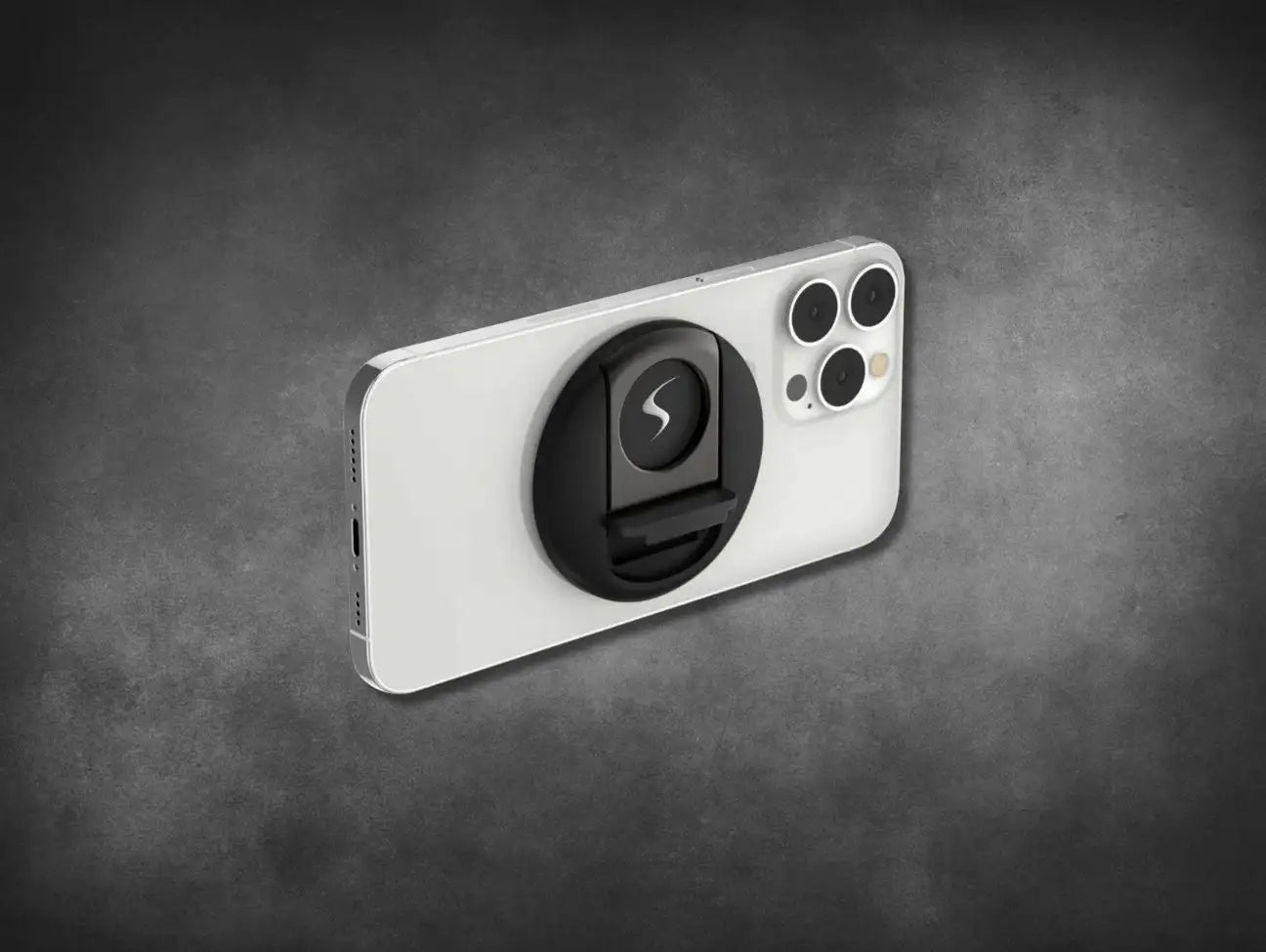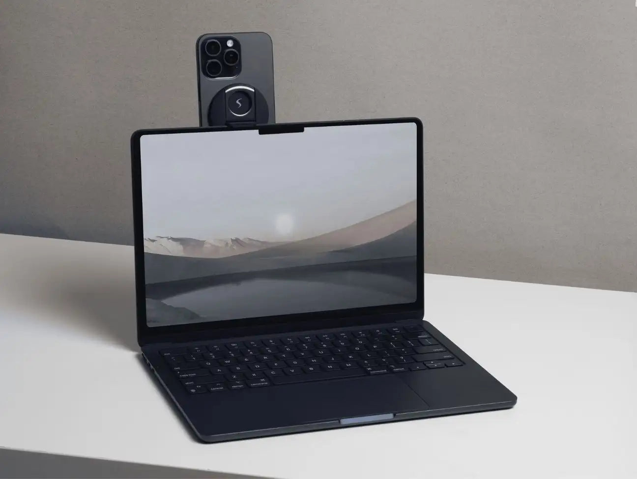 Boost multitasking with the Scapade MagStand — a 360° rotating magnetic iPhone mount made for MacBook users. Perfect for Continuity Camera or side‑screen use, it clips on tool‑free to any MacBook without marks or damage. A strong magnetic grip keeps your iPhone stable, while smooth 360° rotation lets you dial in the ideal angle for streaming, calls, or focus work. Ultra‑compact and travel‑friendly, it’s compatible with MagSafe iPhones (12 and later) and all MacBook Air and Pro models (13", 14", 15", 16"). No setup required — just snap and go.